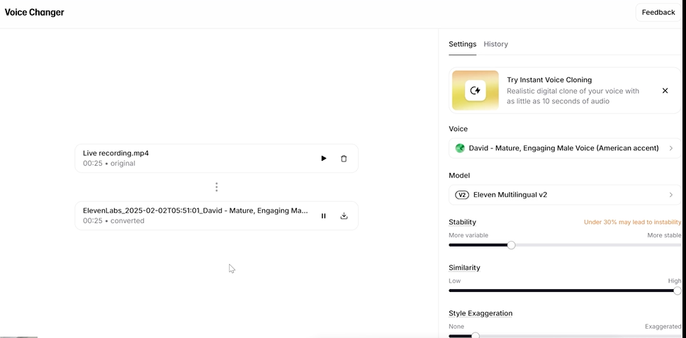 - Creative Control: Adjust parameters like stability, similarity, and style exaggeration to tailor the output to your needs.